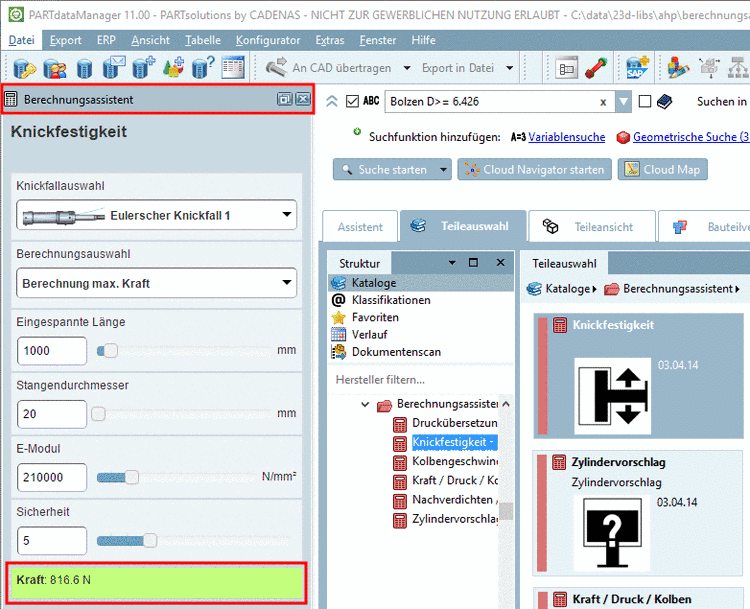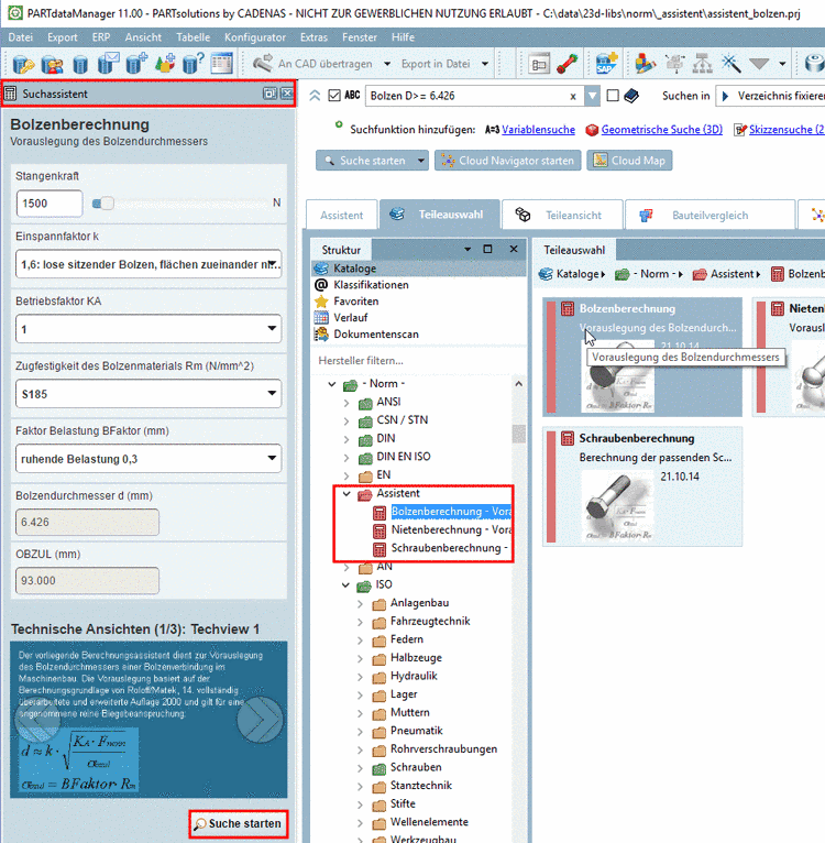 Berechnungsassistenten führen bei Eingabe der Parameter on the fly Berechnungen durch. Das Ergebnis kann unmittelbar zur Orientierung bei der Teileauswahl verwendet werden.