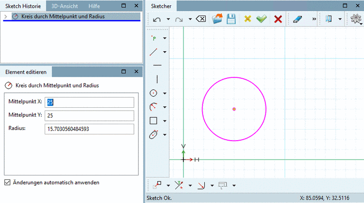 Wenn nötig, passen Sie die Werte der Punkte von Mittelpunkt X, Mittelpunkt Y und Radius im Dockingfenster Element editieren an.