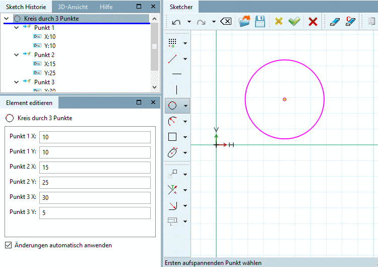 Kreis über drei Punkte bestimmen (freie Punkte, Endpunkte einer Linie, Mittelpunkt eines Kreises, usw.)