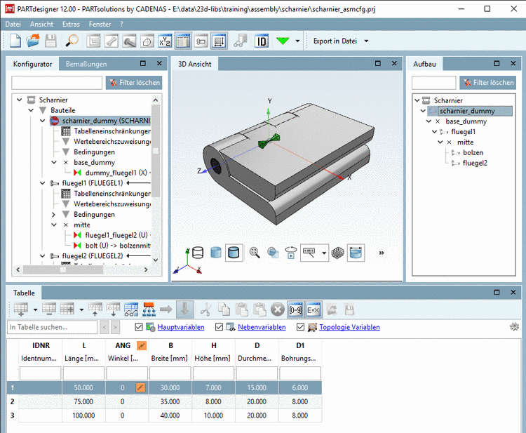 Die Wertebereichsvariable "ANG" befindet sich im Dummy-Teil, welches nicht exportiert wird, aber die Tabelle des Dummy-Teils wird vom Assembly-Tabellenprojekt verwendet. Die Steuerung der Winkelstellung erfolgt so in der Baugruppe.