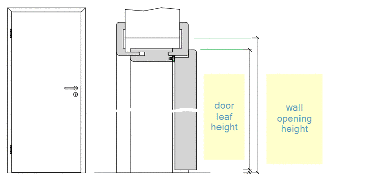 Wandöffnung Breite und Höhe (muss breiter und höher sein als die Türblatt-Breite/Höhe wegen Einbauräumen). Übliche Werte für zuzügliche Abstände sind: +35mm Breite und +17.5mm Höhe. Diese Werte müssen mit dem Hersteller im Projekt-Workshop bearbeitet und finalisiert werden.