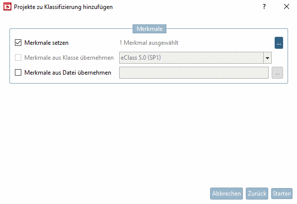 -> Die Ansicht wechselt in den Dialogbereich Merkmale mit den Optionen Merkmale setzen, Merkmale aus Klasse übernehmen und Merkmale aus Datei übernehmen, die im Folgenden näher erläutert werden.
