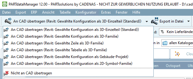 • An CAD übertragen (Revit: Gewählte Konfiguration als 3D-Einzelteil (Standard))