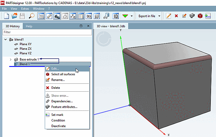 Detaillierte Informationen zum Blend-Feature finden Sie unter Abschnitt 7.6.2.12, „ Blend (Fase/Rundung hinzufügen...) “ in eCATALOG 3Dfindit.