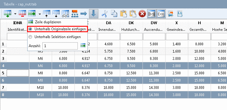 Selektion einer Zeile und 3 Duplikate. Sofern nur es nur eine Originalzeile gibt, spielt die Selektion von Unterhalb Originalzeile einfügen oder Unterhalb Selektion einfügen keine Rolle.