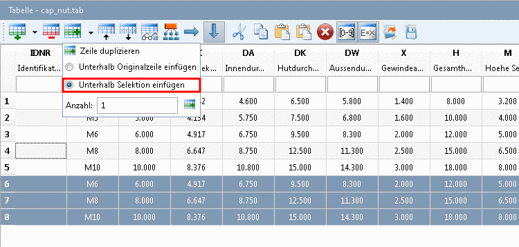 Mit der Pfeiltaste neben dem Button können Sie den Dialog Zeile duplizieren öffnen. Hier haben Sie weitere Optionen zur Verfügung. Sie können eine beliebige Anzahl von Duplikaten erstellen und Sie haben die zwei Einfügeoptionen Unterhalb Originalzeile einfügen und Unterhalb Selektion einfügen.