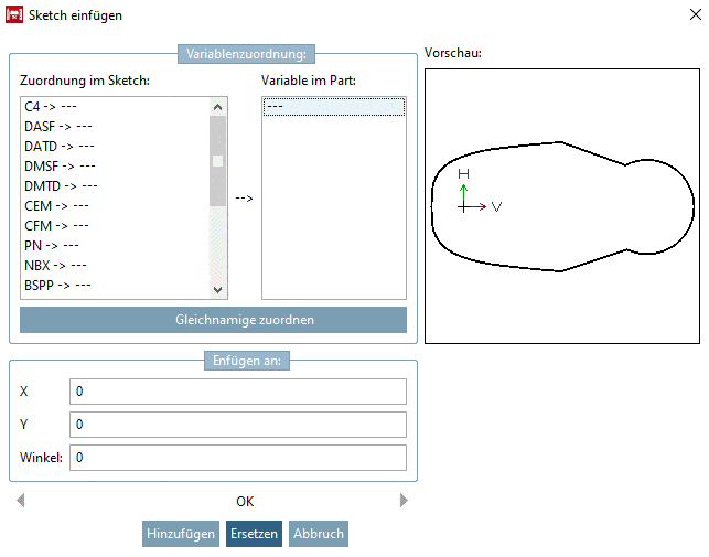 Variablenzuordnung: Sie können einen Abgleich zwischen den Variablen im zu importierenden Sketch und dem aktuell geöffneten PARTdesigner Sketch durchführen. Im Feld Zuordnung im Sketch sehen Sie die Variablen des Importsketches, im Feld Variable im Part die des aktuellen PARTdesigner Sketches.