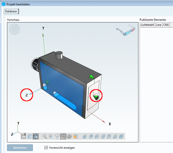 Für die Klassifikation des Lichtstrahls wird ein Anfügepunkt verwendet. Der Lichtstrahl muss gleichgerichtet zur X-Achse des Koordinatensystems des Modells sein. Anfügepunkte haben allerdings ihre eigene Orientierung (ihr eigenes Koordinatensystem).