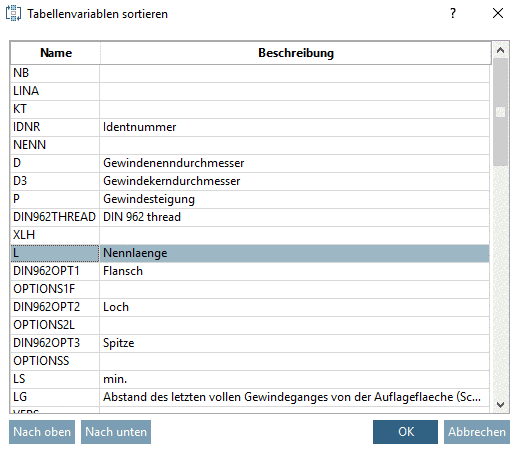 Nach Klick auf den Button öffnet sich das Dialogfenster Tabellenvariablen sortieren. Hier können Sie mit den Buttons und die Position wunschgemäß setzen.
