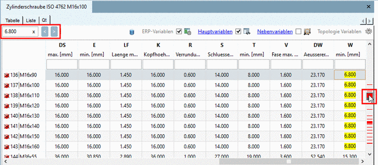 Das folgende Beispiel zeigt eine komplette Suche über Einstellung der Suchoptionen, Ergebnisliste und Aufruf der Teileansicht. Gesucht wird eine Sechskantschraube mit Nenndurchmesser 30 und Länge 100.