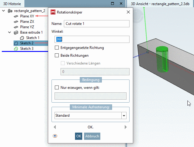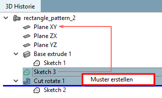 .Selektieren Sie den Historienpunkt Cut Rotate (basiert auf Sketch mit Musterursprung) und bei gehaltener Strg-Taste auch den Sketch, welcher die Musterpunkte enthält.