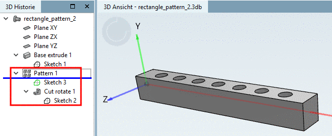 Endergebnis: Das Bohrungsmuster ist eingefügt. In der 3D Historie sehen Sie den Konstruktionsschritt Pattern.