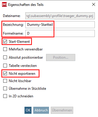 finishedauf den Kontextmenübefehl Neues Projekt.Fügen Sie aus dem Verzeichnis .../partsolutions/23d-libs/training/subassembly/profile das Dummy-Startteil ein und nehmen Sie auf der Dialogseite Eigenschaften des Teils die entsprechenden Eintragungen vor.