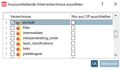 Sobald das Auswahlkästchen in der Spalte Verzeichnisse aktiviert ist, wird das Verzeichnis weder auf den Publizierungsserver (PARTcommunity) hochgeladen noch wird es Inhalt der CIP-Datei.