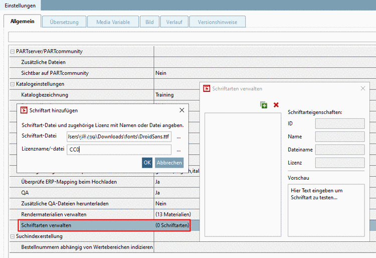 Wenn Sie auf das Plus-Zeichen klicken, öffnet sich das Dialogfenster Schriftart hinzufügen. Bestimmen Sie Schriftart-Datei und Lizenzname/-datei und bestätigen Sie mit .