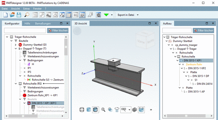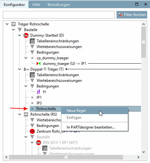 Klicken Sie im Dockingfenster Konfigurator, im Bauteil "Doppel-T-Träger (T)", im Kontextmenü des Anfügepunktes "Rohrschelle", auf den Befehl Neue Regel.