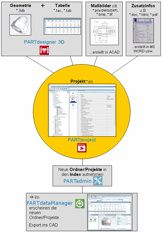 In PARTproject werden alle Informationen zusammengeführt, die für die Darstellung und Auswahl von Bauteilen und Baugruppen in PARTdataManager erforderlich sind.