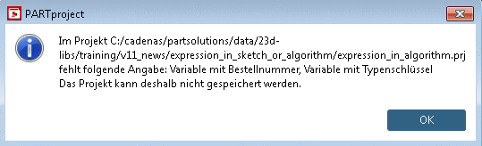 Hinweis Fehlt unter PARTproject -> Projekt bearbeiten -> Registerseite Allgemein -> Variablen -> Variable mit Bestellnummer und/oder Variable mit Typenschlüssel ein entsprechender Eintrag, erscheint eine Fehlermeldung.