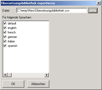 Übersetzungen exportieren: Das Dialogfenster Übersetzungsbibliothek exportieren wird geöffnet. Darin können Sie alle bzw. nur eine Auswahl aus den angelegten Sprachdateien als *.csv-Datei exportieren. Legen Sie im Feld Datei den Ziel-Speicherort dieser Bibliothek fest.