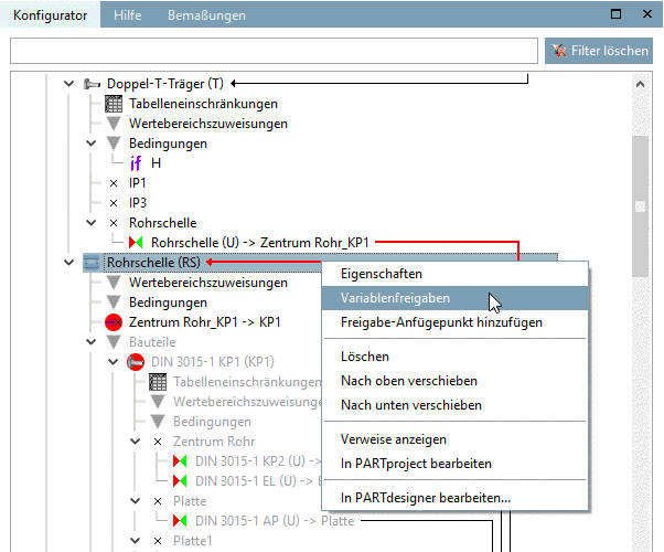 Klicken Sie im Dockingfenster Konfigurator, im Kontextmenü der "Rohrschelle (R)", auf den Befehl Variablenfreigaben.