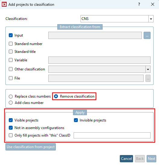 Im Dialog Projekte zu Klassifizierung hinzufügen [Add projects to classification] wurde der Dialogbereich Apply mit neuen Filteroptionen zugefügt. Außerdem ist es nun auch möglich Klassifizierungen zu löschen (und das Löschen ebenfalls einzuschränken).