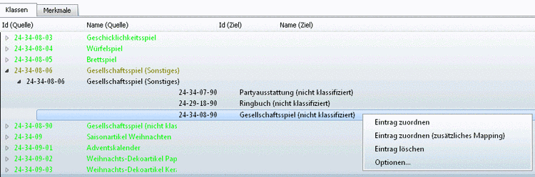 Links werden die verfügbaren Klassensysteme angezeigt, in der zweiten Ebene die Klassensysteme, die bereits gemappt sind (schwarz), bzw. die, für die noch ein Mapping durchgeführt werden kann (grau).