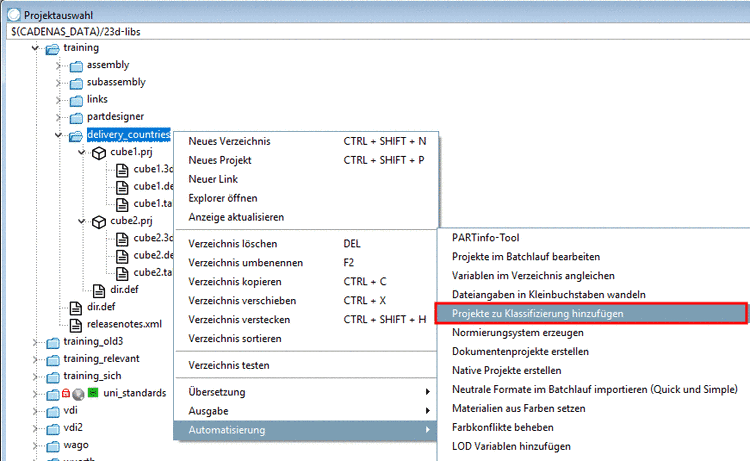 Sie können auf der Basis eines bereits klassifizierten Projektes beliebige andere Projekte unterhalb eines bestimmten Verzeichnisses der Klasse im Batchmodus hinzufügen.