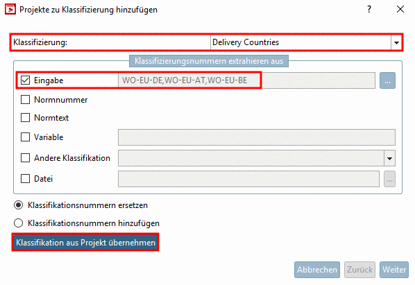 Wählen Sie im Listenfeld unter Klassifizierung die Option Delivery Countries.