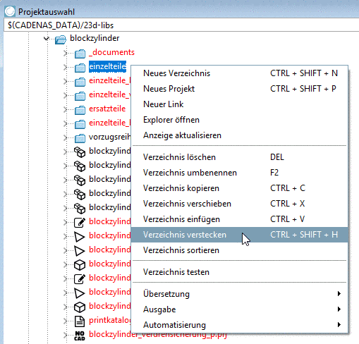 Verzeichnis verstecken blendet das markierte Verzeichnis aus dem Baum der verfügbaren Verzeichnisse (im PARTdataManager) aus. Das ist beispielsweise bei Teilen sinnvoll, die nur in Baugruppen vorkommen und nicht einzeln wählbar sein sollen.
