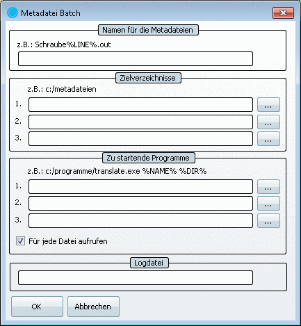 Im Feld Zu startende Programme legen Sie das Programm fest, das geöffnet werden soll und den jeweiligen Zeileninhalt ggf. „weiterverarbeitet“. %DIR% zieht die zuletzt übergebene Datei heran, %NAME% übernimmt den Namen der jeweiligen Datei. Ist die Option Für jede Datei aufrufen aktiviert, wird das Programm mit jeder übergebenen Zeile stets erneut gestartet, andernfalls erfolgt der Aufruf nur einmal am Ende des Batch.