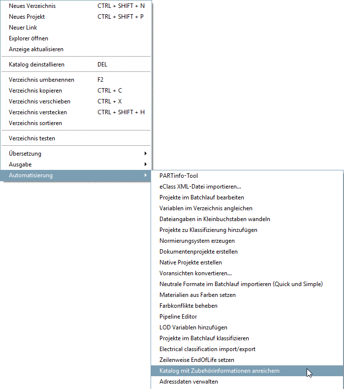 Selektieren Sie in PARTproject das gewünschte Verzeichnis und klicken Sie auf den Befehl Katalog mit Zubehörinformationen anreichern.