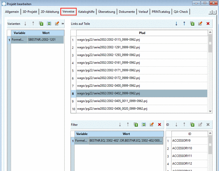 Die Funktion Katalog mit Zubehörinformationen anreichern bietet die Möglichkeit, Mapping-Informationen aus einer CSV-Datei einzulesen. In PARTproject werden dann auf der Registerseite Verweise die entsprechenden Einträge automatisch gesetzt und im Endergebnis die Zubehörteile in PARTdataManager angezeigt.