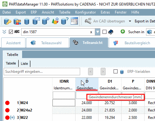Die Inhalte des Feldes Beschreibung werden im PARTdataManager in den Spaltenuntertiteln der Tabelle angezeigt. Wenn Sie die Maus über den Spaltenkopf führen, wird im Tooltip der volle Text angezeigt. Im Spaltenkopf selbst ist nur eine begrenzte Breite verfügbar.