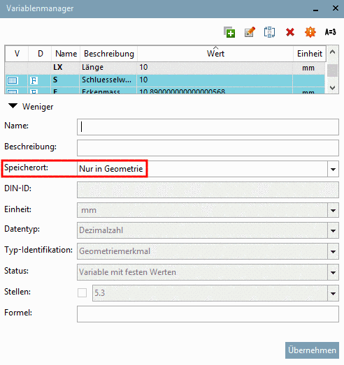 Wird zunächst nur die Tabelle angelegt, ist es ausreichend, die Option Nur in Tabelle zu wählen. Später müssen diejenigen Variablen, die für die Anlage des Modells (im Sketcher) benötigt werden, auch in der 3db-Datei gespeichert werden.