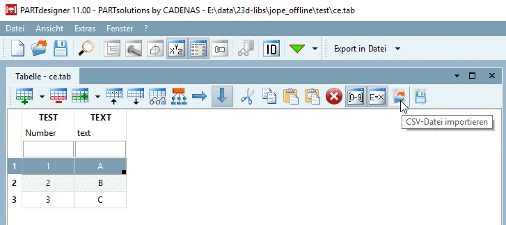 Es sollen die Daten aus folgender CSV-Datei eingelesen werden. TEST und TEXT mit denselben Werten wie in der Ausgangssituation sind schon enthalten. Die übrigen Daten sollen nun zusätzlich in die Tabelle aufgenommen werden.