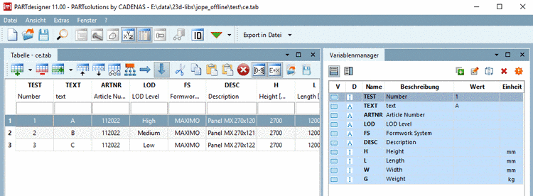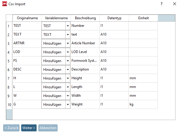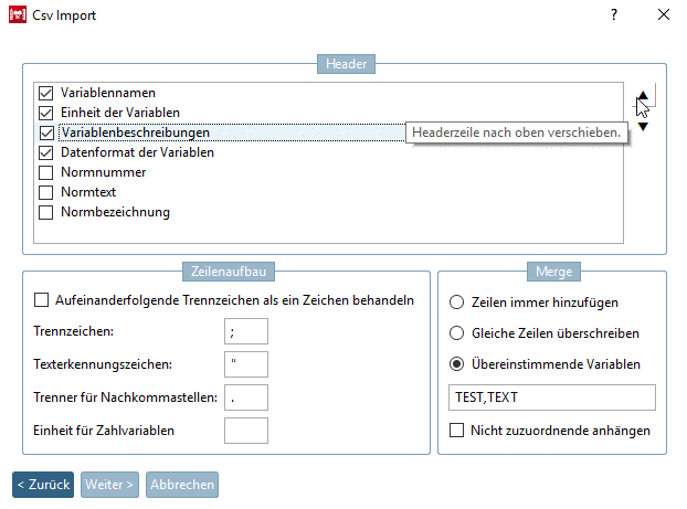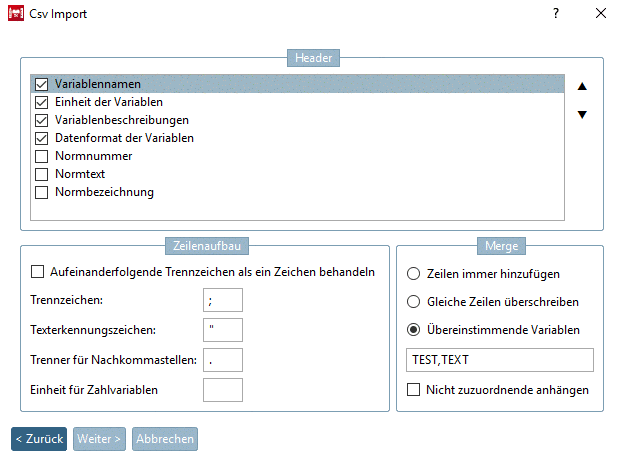 Falls innerhalb der CSV-Datei noch keine Einheit festgelegt sein sollte, können Sie dies im Feld Einheit für Zahlvariablen tun.
