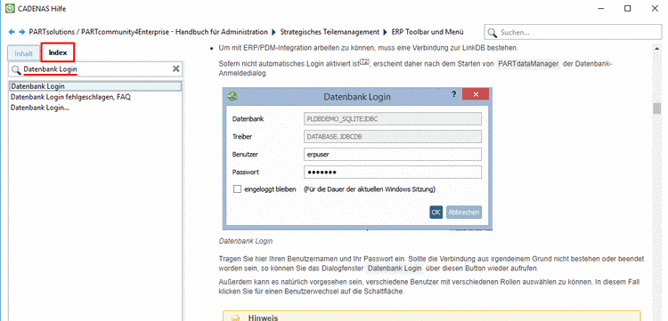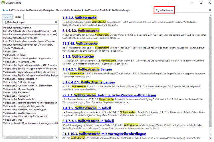 In der Indexansicht erhalten Sie eine alphabetische Auflistung aller Indexbegriffe. Selektieren Sie einfach den gewünschten Begriff, um rechts die entsprechende Hilfe angezeigt zu bekommen.