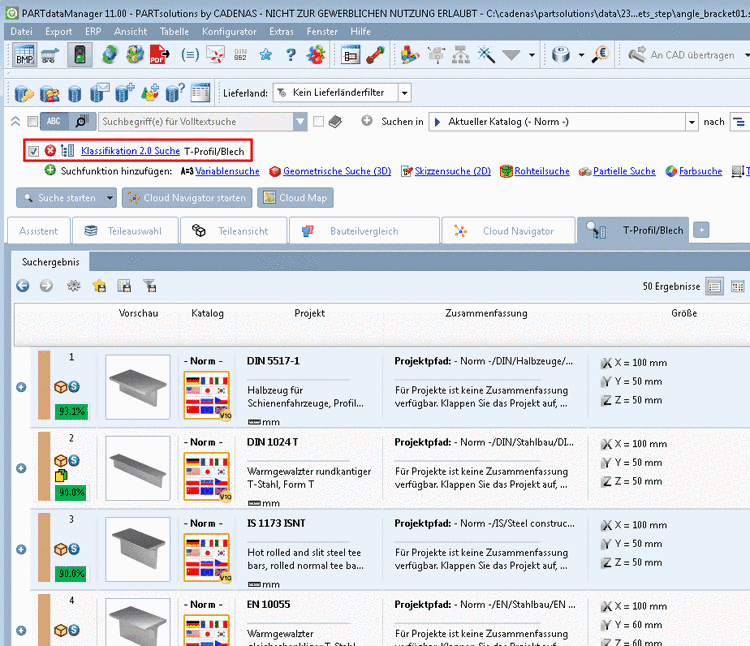 Eigenfertigungsteile aus Halbzeugen, etc. können mit der Klassifikation 2.0 Suche, d.h. einem Basissuchkatalog und anpassbaren Suchvorlagen, einfach gefunden werden.