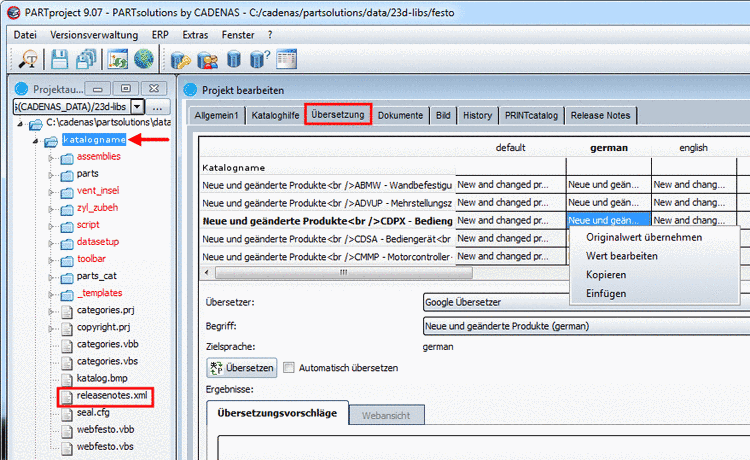 Die Übersetzung von Release Notes innerhalb von PARTproject ist mit Version 9.07 optimiert worden. Sobald der Katalog selbst, links im Baum, selektiert wird und rechts im Fenster Projekt bearbeiten die Registerseite Übersetzung, werden die einzelnen Notes zeilenweise aufgelistet.