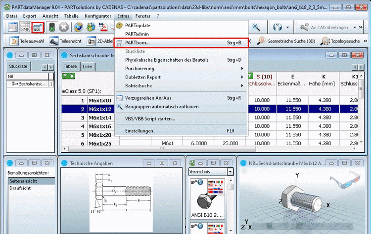 Übergeben Sie das markierte Teil an PARTbom, indem Sie den Button Übergabe an Stückliste (PARTbom) anklicken.