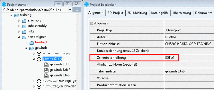 Die folgenden Abbildungen zeigen den Stift mit verschiedenen Gewindesteigungen und die 2D-Ableitung im PARTdataManager.