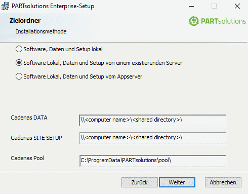 Software Lokal, Daten und Setup von einem existierenden Server: Wurde eine Server-Installation durchgeführt und die Verzeichnisse CADENAS_DATA und CADENAS_SETUP dort freigegeben, kann ein Client installiert werden, bei dem die Software lokal liegt, aber man auf die anderen Verzeichnisse verweist.