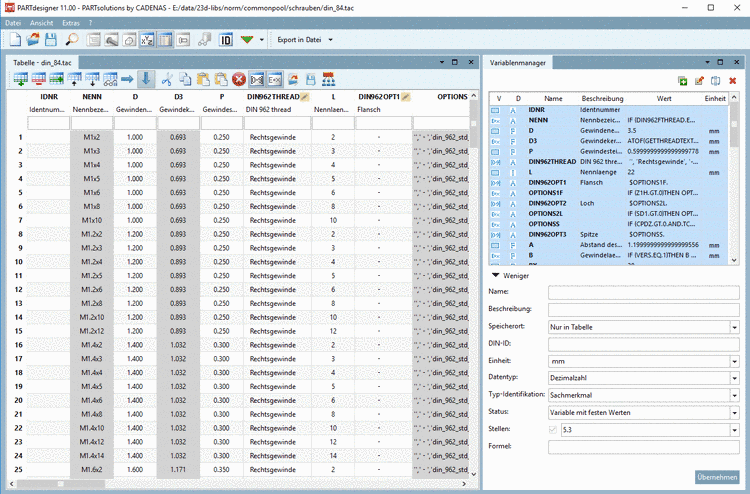 Im PARTdesigner werden - anstelle von festen Bemaßungswerten - Variablen eingerichtet, für die in Tabellen konkrete Werte hinterlegt sind. Diese Methode hat den Vorteil, dass nicht für jede Bauteilausprägung eine eigene Zeichnung erstellt werden muss.