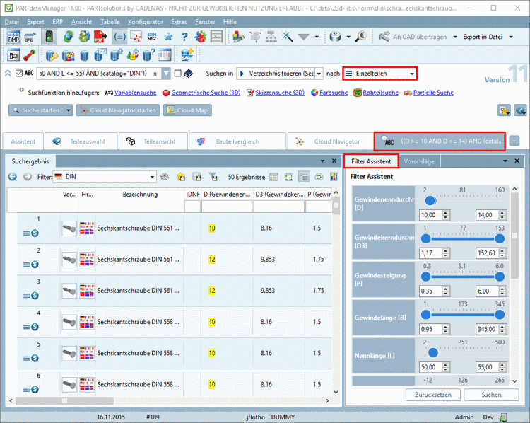 Mit der Topologiesuche können Sie beispielsweise sehr gut Abmessungen hinzufügen und verbessern so die Trefferqualität. Evtl. bekommen Sie so den gewünschten Treffer an erster Position und ersparen sich das Scrollen durch die Ergebnisliste.