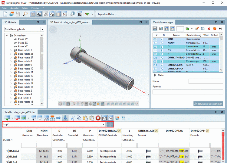 Hier wird verdeutlicht, wie eine Suche direkt korrekte Ausprägungen liefern kann, die im Docking-Fenster Bauteilvergleich sowohl textuell (Tabellenvariablen, topologische Merkmale und Klassenmerkmale) als auch geometrisch in der 3D-Ansicht überprüft werden können und das Wunschteil unmittelbar ins CAD-System exportiert werden kann.