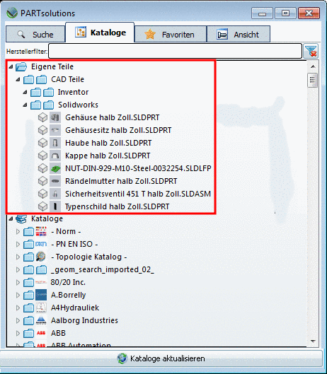 Unter Eigene Teile finden Sie die Teile, welche Sie über PARTsolutions-Menü -> Eigene Bibliothek -> Aufnehmen
