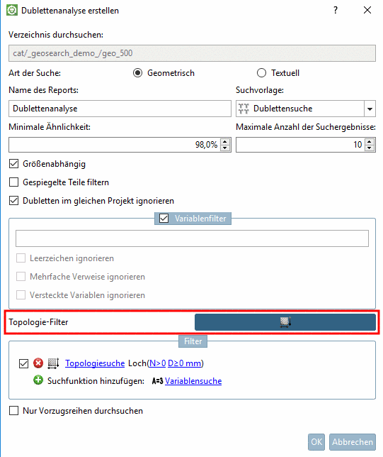 Bei Dublettenanalyse ist die neue hilfreiche Option Topologie-Filter hinzugekommen. Hintergrund ist, dass die geometrische Suche, welche die Basis der Dublettenanalyse ist, manche Details wie unterschiedliche Lochmuster nicht einbezieht und damit in manchen Fällen 100% Übereinstimmung anzeigt, was nicht korrekt ist.