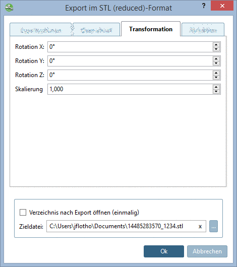Auf der Registerseite Transformation können Sie für das exportierte Bauteil die Achsenorientierung und Skalierung anpassen.