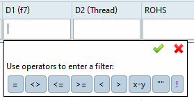 In den Filter-Eingabefeldern der Tabelle unter Suchergebnisse [Search results] und bei der Topologiesuche [Topology search] wird ein Hilfe-Dialog mit möglichen Operatoren angezeigt. In der Topologiesuche [Topology search] stehen die Methoden exakte Reihenfolge [exact order] und Strikte Suche [Strict search] nicht zur Verfügung.