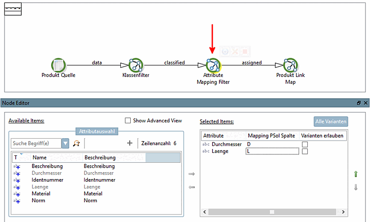 Übertragen Sie die zur Bestimmung der korrekten Ausprägung benötigten Variablen per Pfeiltaste von links nach rechts. Für die hier beispielhaft verwendete DIN 913 sind dies die Variablen "Durchmesser" und "Laenge".